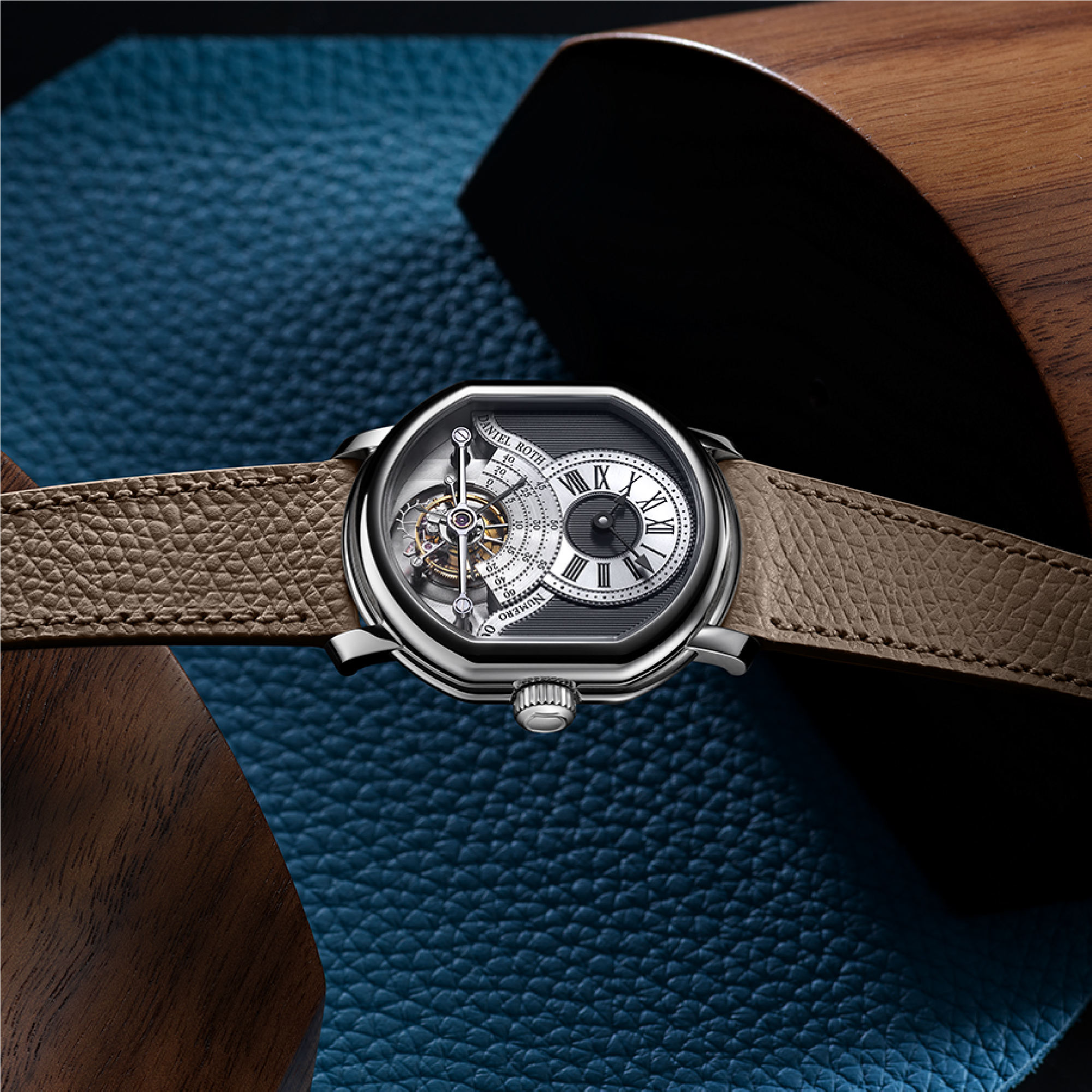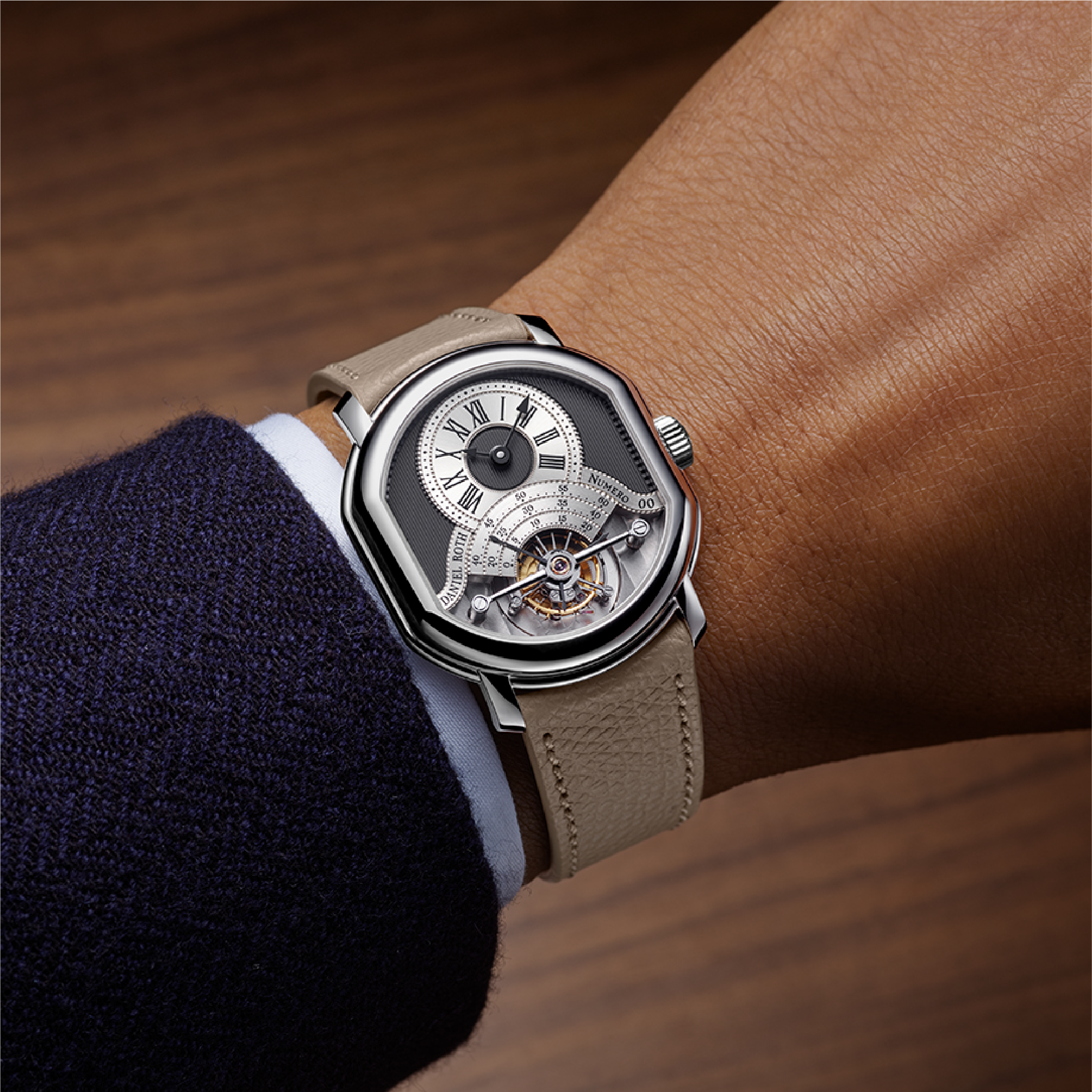 Inside beats the DR001: a fully hand-finished, shaped tourbillon calibre developed for the revival of Daniel Roth. Echoing the original Souscription pieces but with higher performance, the movement features 206 components, gold chatons, 80 hours of power reserve, and traditional finishing techniques visible through the sapphire caseback.