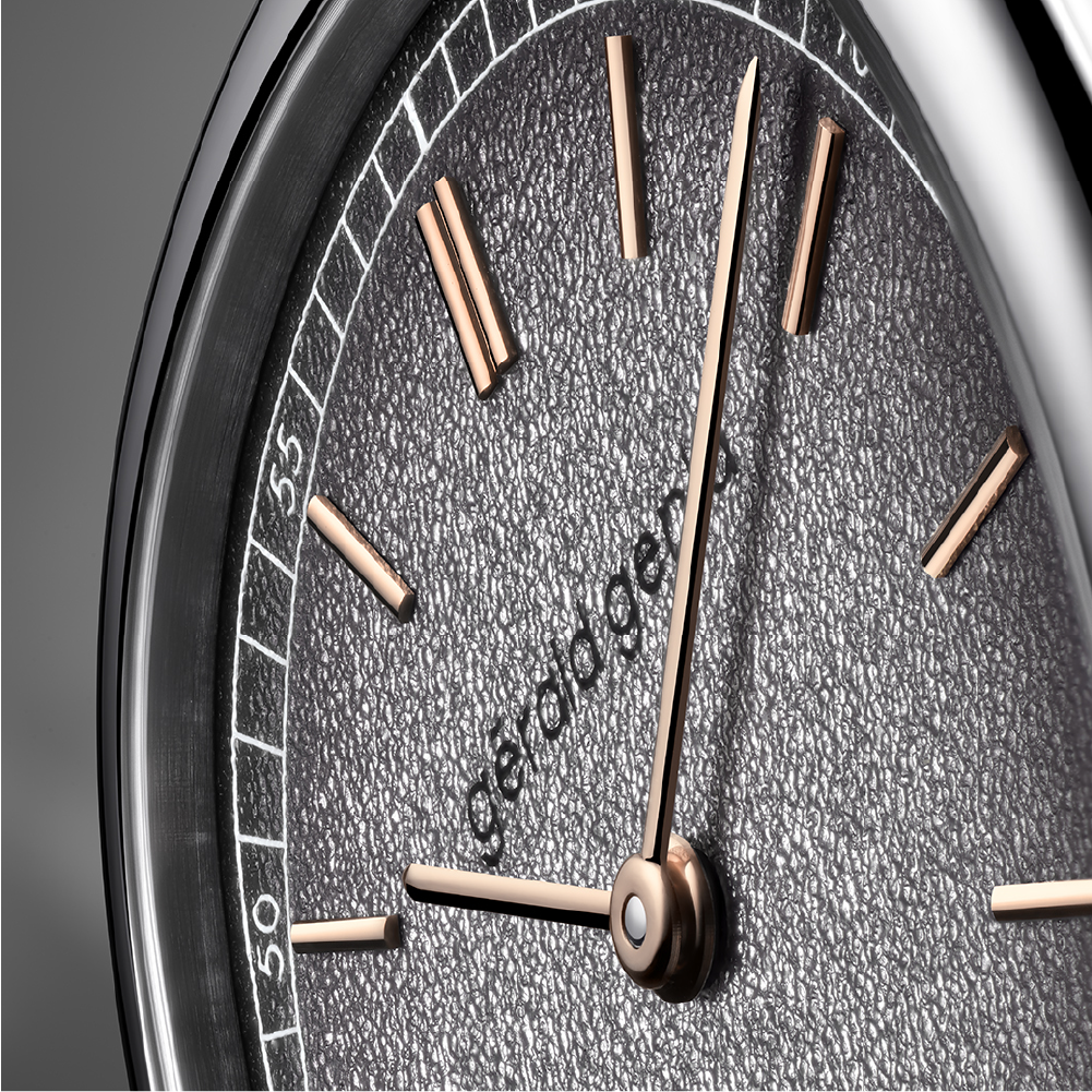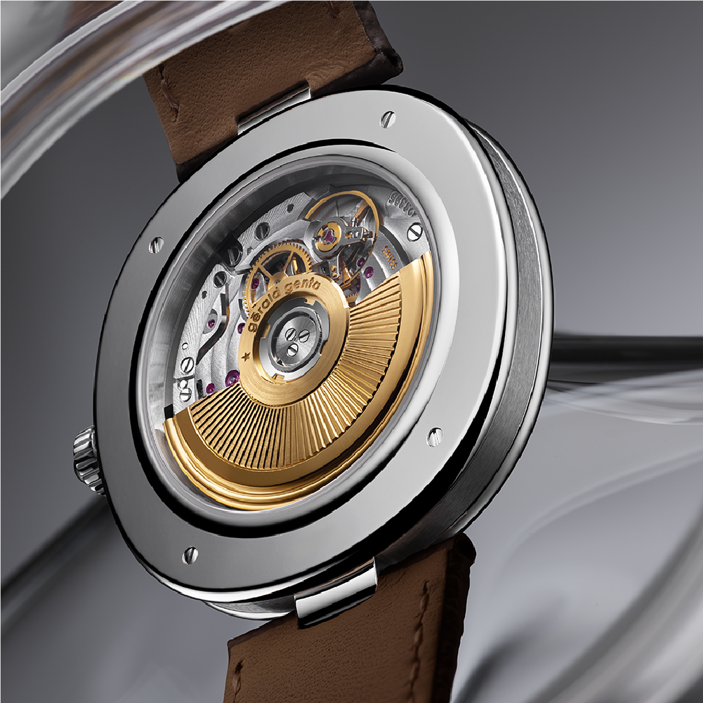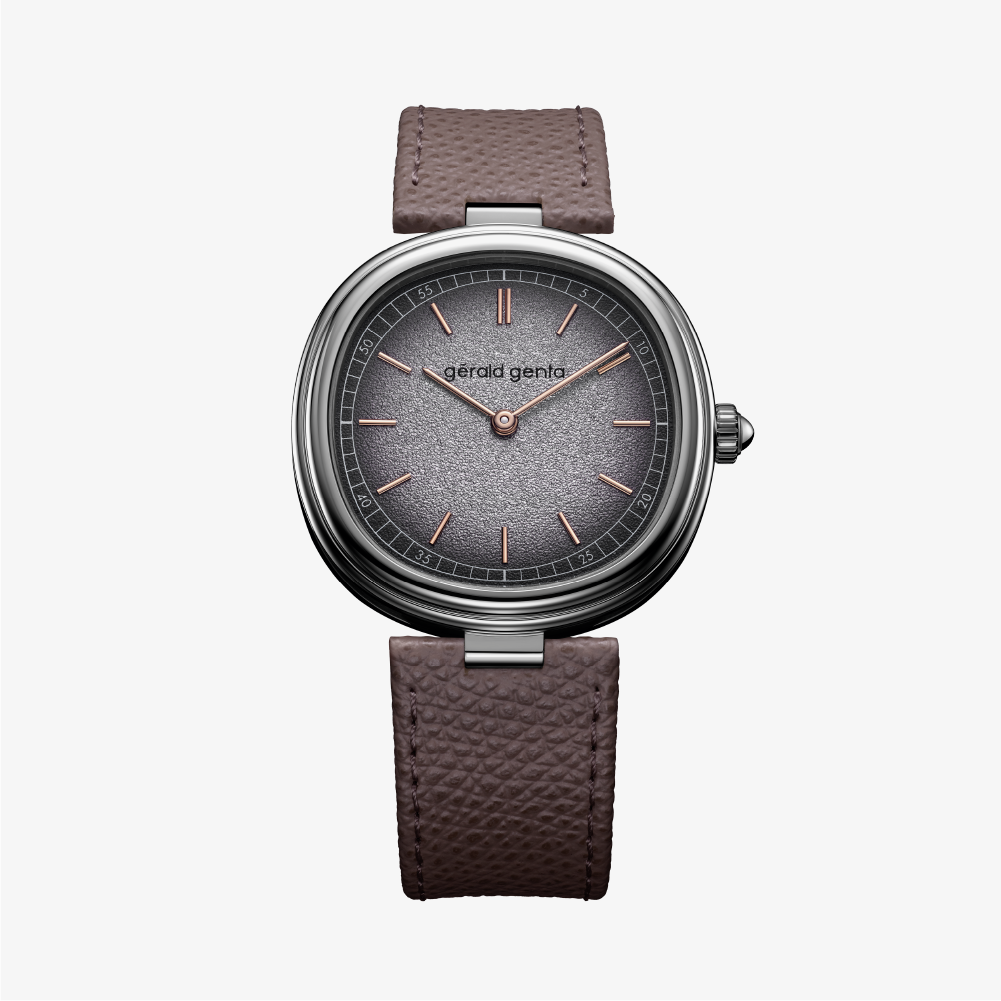 A silver-shaded grained brass dial anchors the design, while rose-gold hands and indexes introduce contrast and warmth — a subtle nod to Genta’s love of character and craftsmanship. The two-segment minute track enhances visual depth without interrupting the calm flow of time.