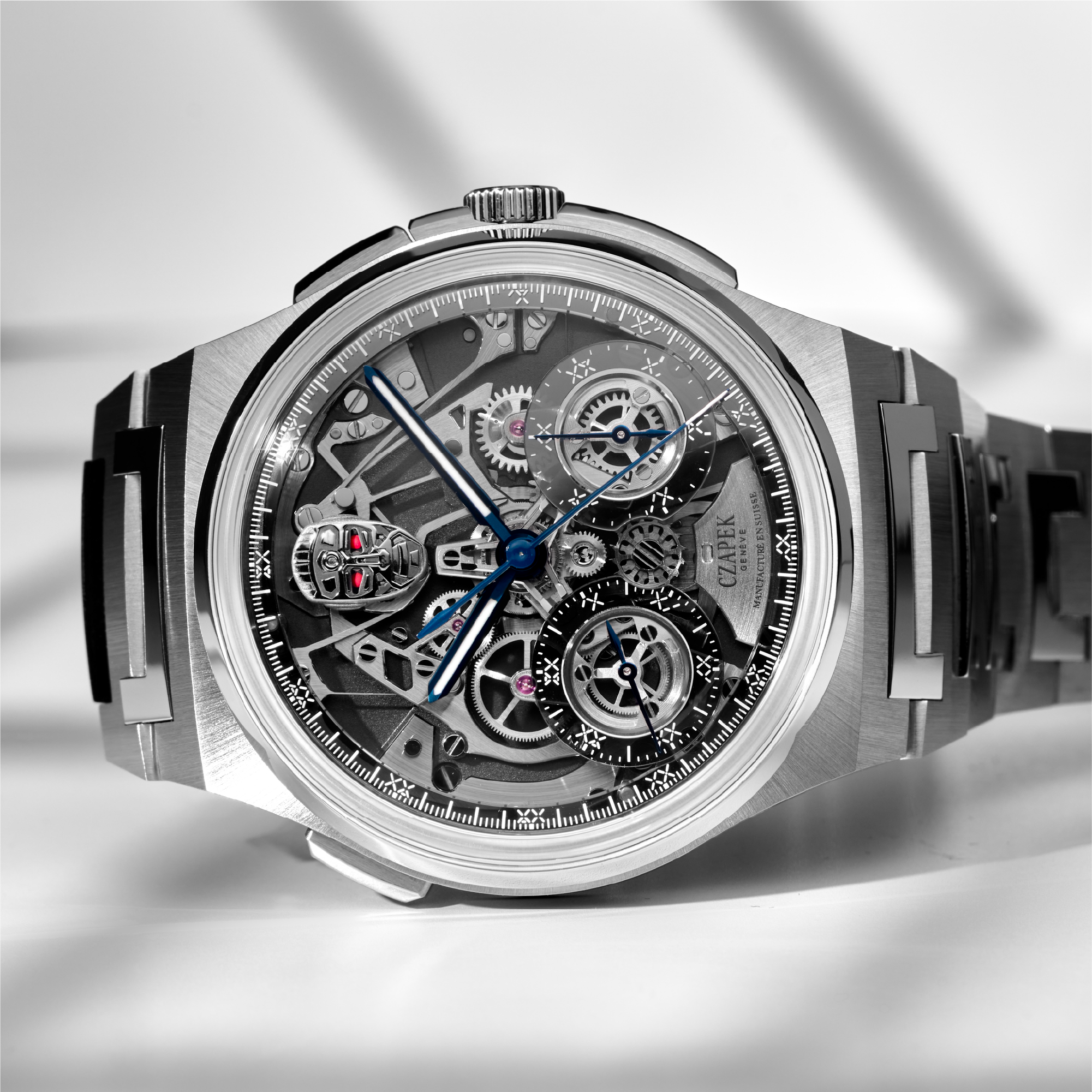 The dial is layered with futuristic details: a white chronograph hand, a blue aluminium rattrapante hand tipped in white, and robot-language “XX” markers inspired by Predator’s Yautja alphabet — a subtle nod to science fiction and Czapek’s own Xavier de Roquemaurel.