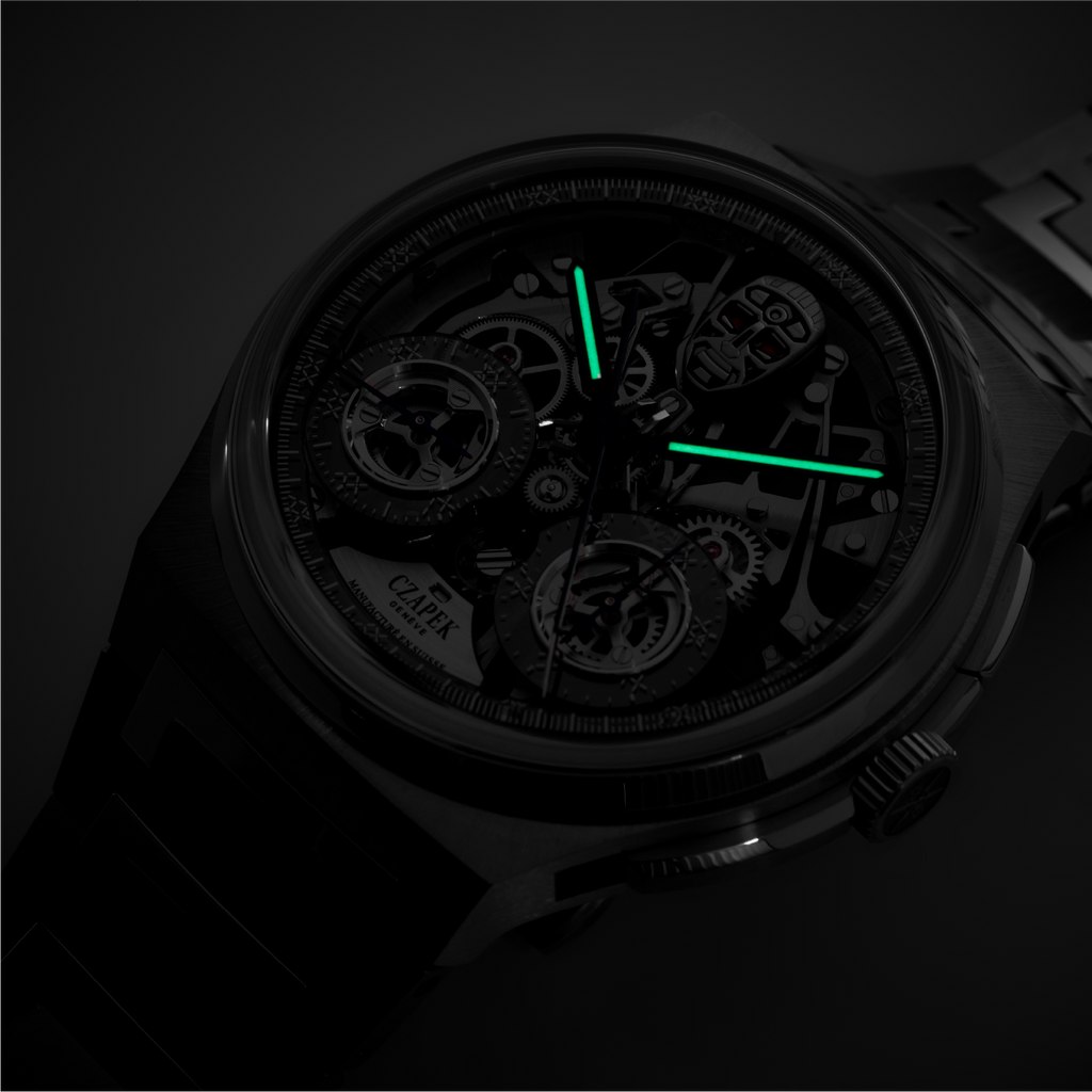The Antarctique Rattrapante R.U.R. is Czapek & Cie’s boldest take yet on its signature split-seconds chronograph. Beneath a grey-metallised sapphire dial, a titanium robot head — hand-polished, laser-engraved, and micro-painted — animates with every press of the chronograph pushers. Start, its eyes flash yellow. Stop, they burn red. Reset, they glow blue. A playful animation, hardwired into haute horlogerie.