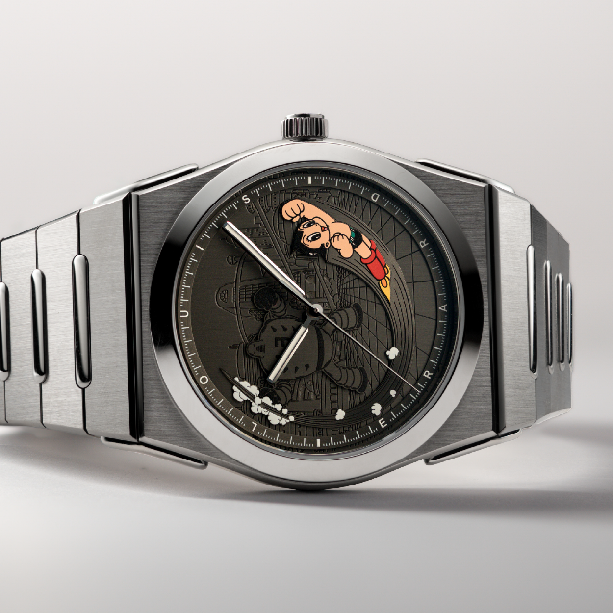 Astro Boy is applied, not printed, layered on the dial with dynamic depth and motion. Behind him: a subtle engraving of Metro City and one of his iconic foes, rendered in black. Every element builds a cinematic scene of motion, light, and emotion — illuminated at night by Super-LumiNova SLN-C1.