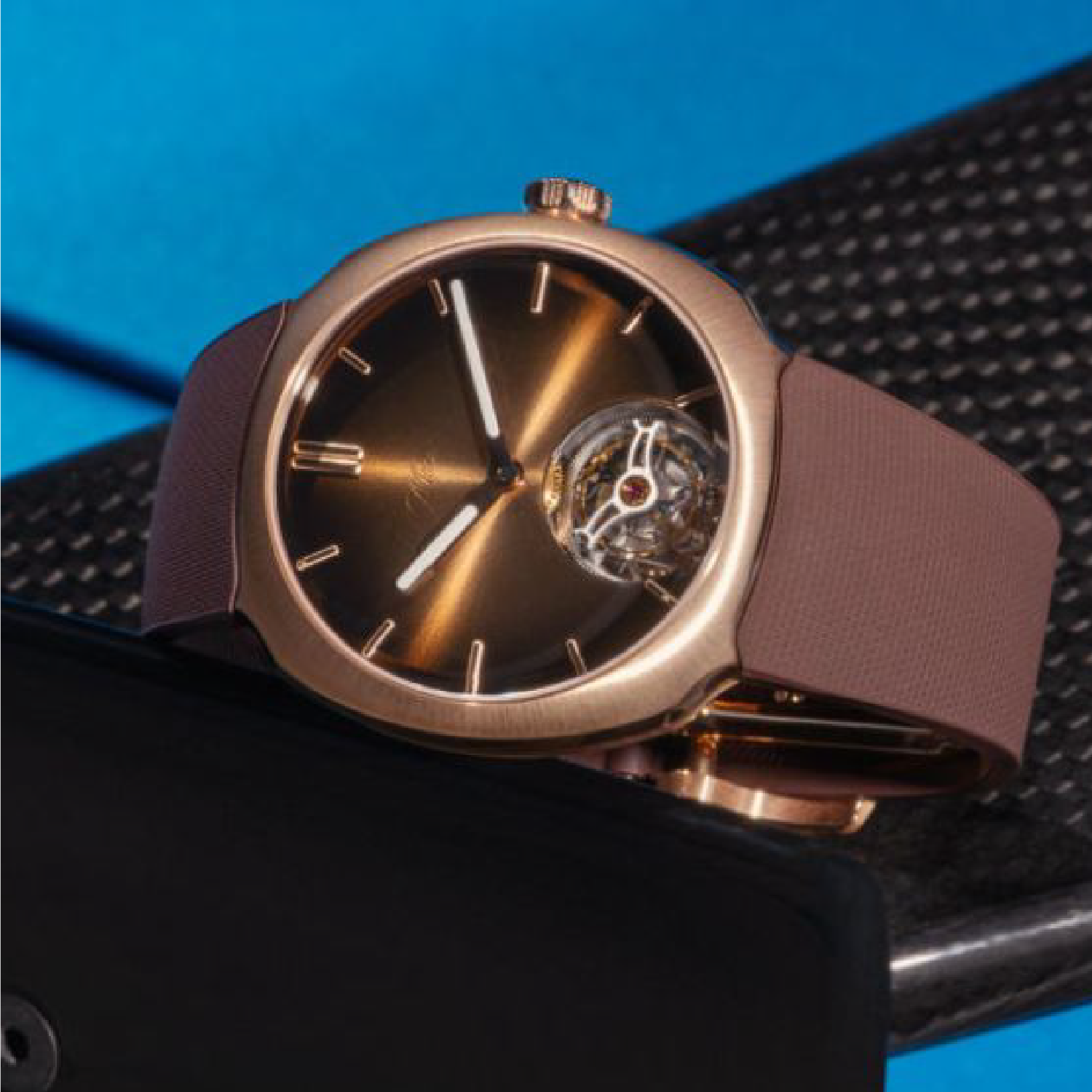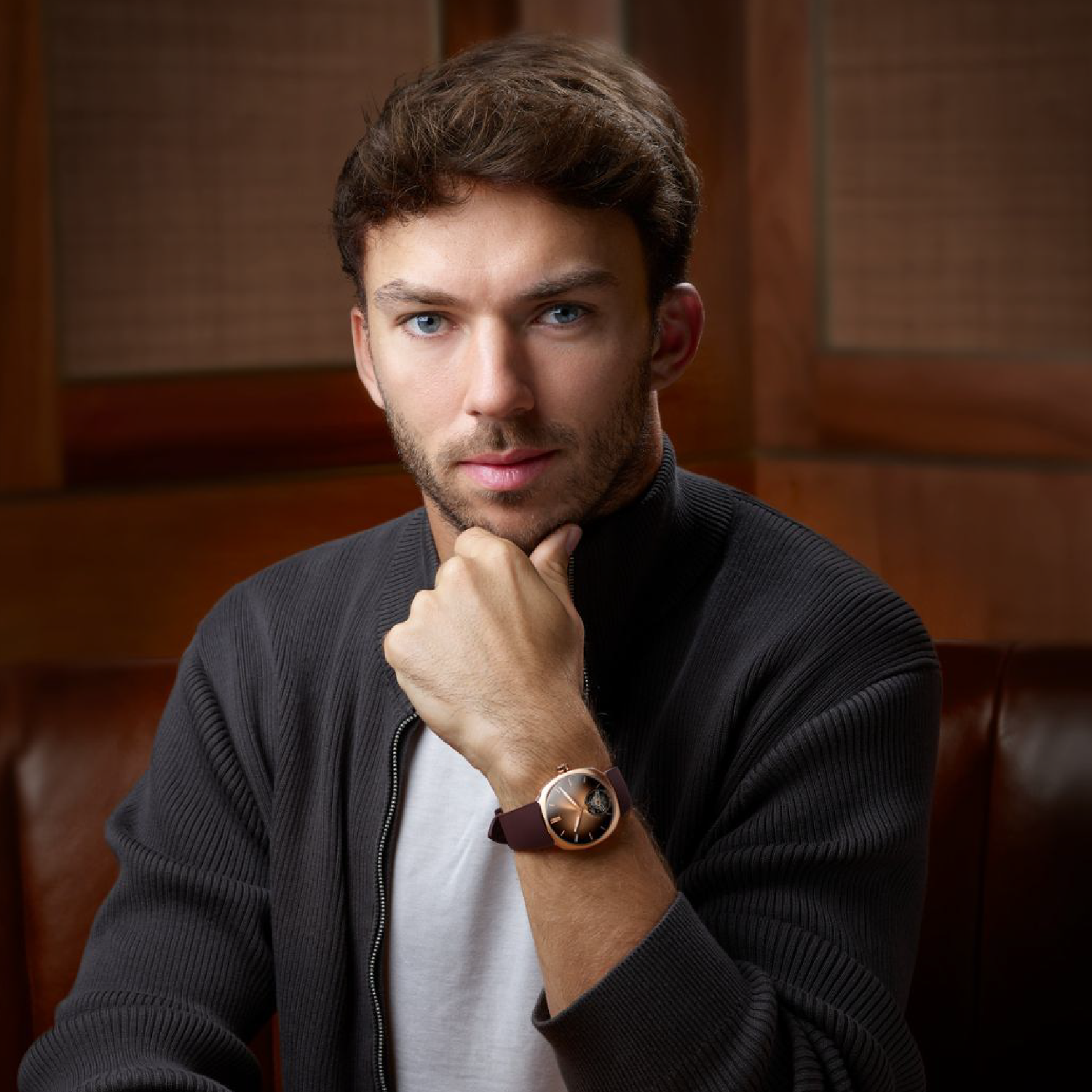 Paired with a chocolate-coloured rubber strap, the piece balances luxury with a sporting edge — a nod to Gasly’s racing world. Every element has been considered down to the millisecond, resulting in a timepiece that is both deeply personal and uncompromisingly refined.