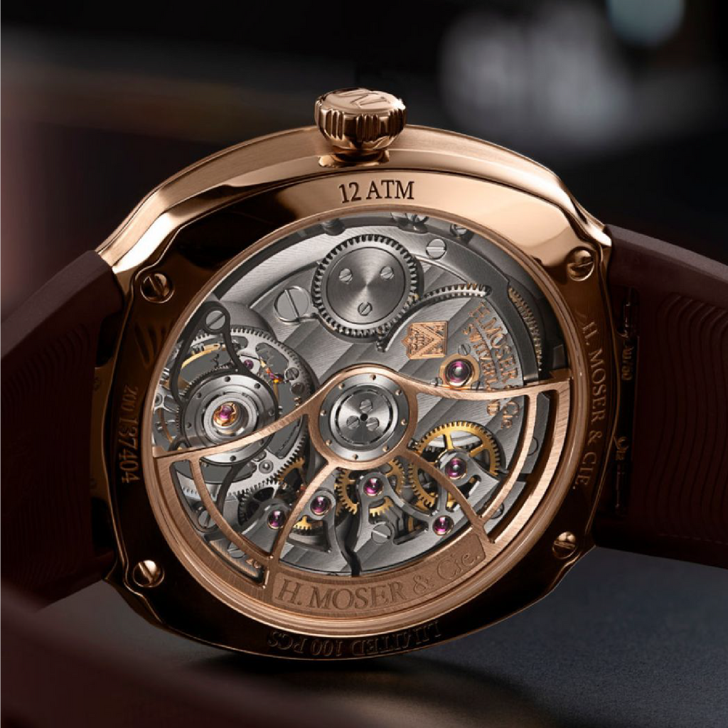 Housed in a 40 mm 5N red gold Streamliner case, this limited edition of 100 pieces is powered by the HMC 805 automatic calibre, fitted with Moser’s in-house double hairspring. The tourbillon rotates once per minute, counteracting the effects of gravity on precision, while the partially skeletonised bridges and anthracite grey finishing of the movement reveal Moser’s technical artistry.