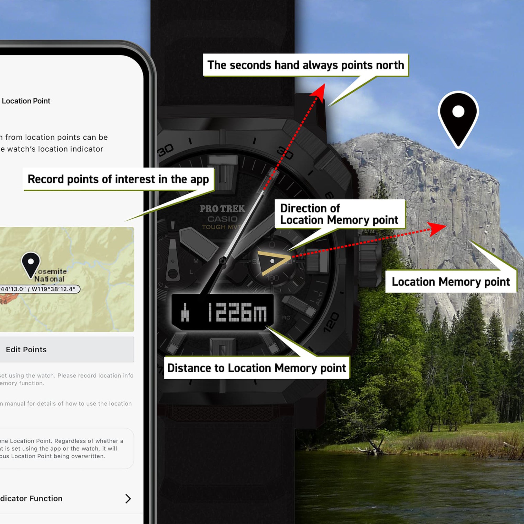 Scale even steeper heights with the PRO TREK PRW-B1000, built to take on some of the most extreme outdoor adventures. The square stainless-steel bezel, inspired by the iconic vertical rock formation of Yosemite’s El Capitan, calls you to take on similar challenges. The indicator hand of the inset dial at the 9 o’clock position evokes the old-school piton once used in rock climbing — honoring a spirit of adventure and respect for nature. This watch climbs far beyond ease and style. Tough Solar delivers charging you can rely on, even from a weak indoor light source, and you can count on radio-controlled calibration and LED lighting to get you through long treks and overnight trips. PRO TREK watches deliver triple sensor measurements to keep you updated with direction, barometric pressure, altitude, and temperature readings. This PRO TREK is the only one equipped with both Bluetooth and Multiband 6, two ways to ensure precision timekeeping. With Multiband 6, even when far away from the Internet, the PRW-B1000 tunes in to radio signals to calibrate the time in places as far flung as Japan (2 stations), China, North America, the UK, and Germany.