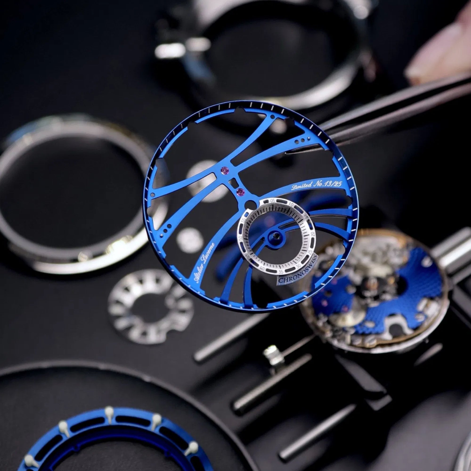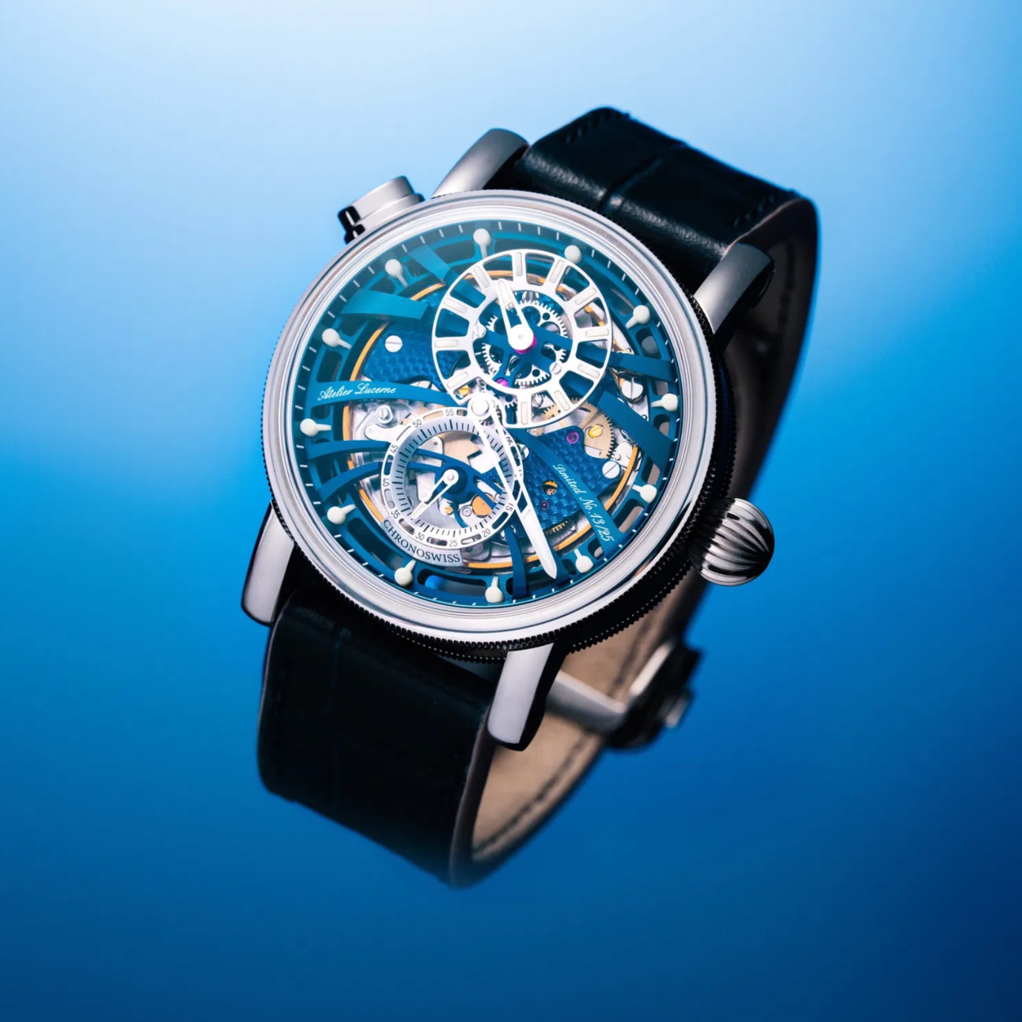 The Q-Repeater Blue Note is a bold fusion of tradition and innovation - where mechanical sound meets contemporary design. Its skeleton dial, finished in deep navy blue CVD, reveals the intricate architecture of the quarter repeater, chiming the hours and quarter hours on demand. Inspired by the expressive "blue notes" of jazz, this timepiece plays with depth, tone, and mechanical rhythm. The 42mm Grade 5 titanium case houses the Chronoswiss legacy movement, reimagined by the Atelier in Lucerne. A floating 3D regulator layout, luminous details, and visible hammers at 1 o’clock turn every chime into a visual and acoustic performance. Limited to just 25 pieces, the Blue Note is independent watchmaking at its most refined.