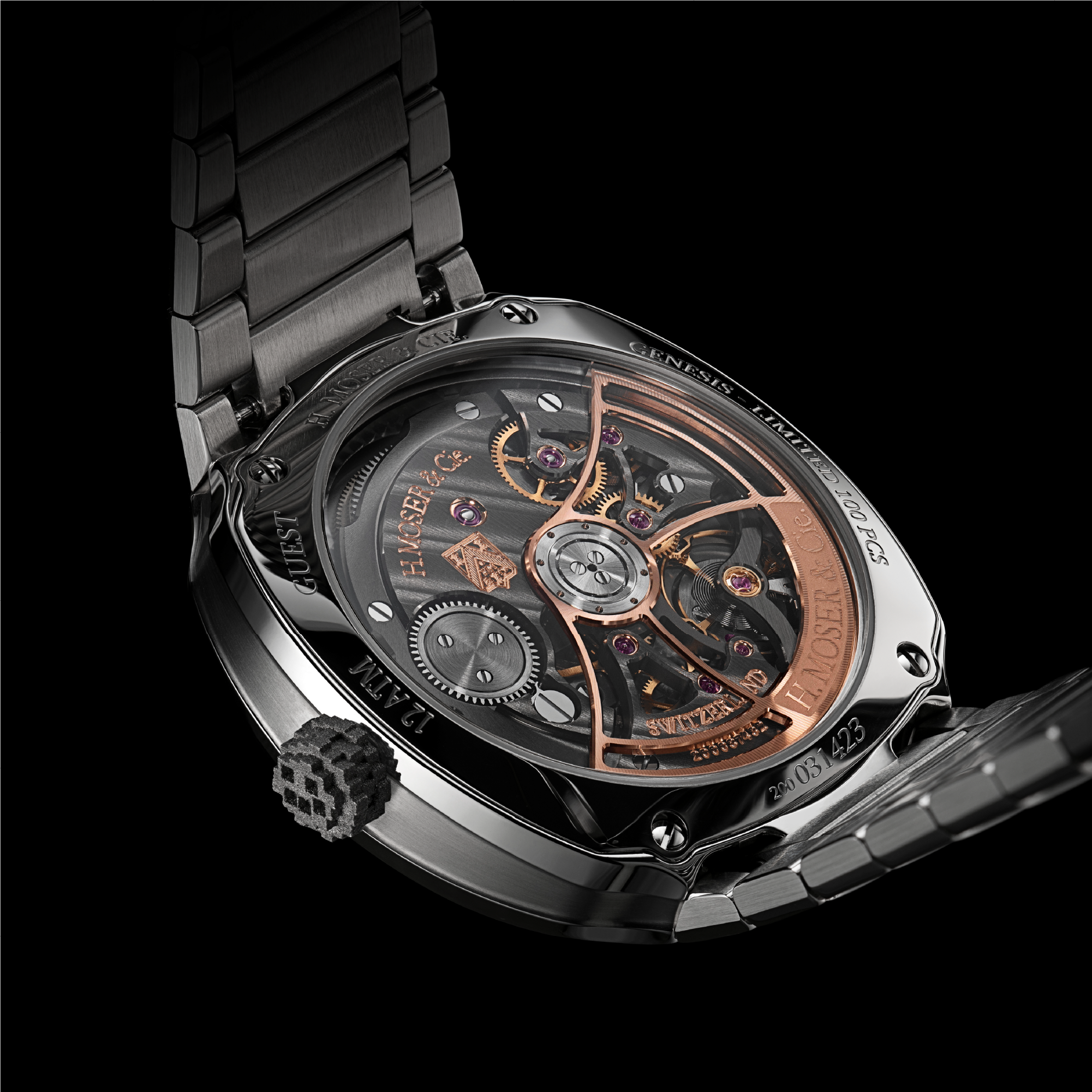 The iconic pixelated elements of the first Genesis return in subtle form: a 3D-printed titanium crown and pixel-style Globolight® inserts on the hands. Digital language translated into physical texture — a reminder of the trilogy’s origin, now rooted in steel instead of the screen.