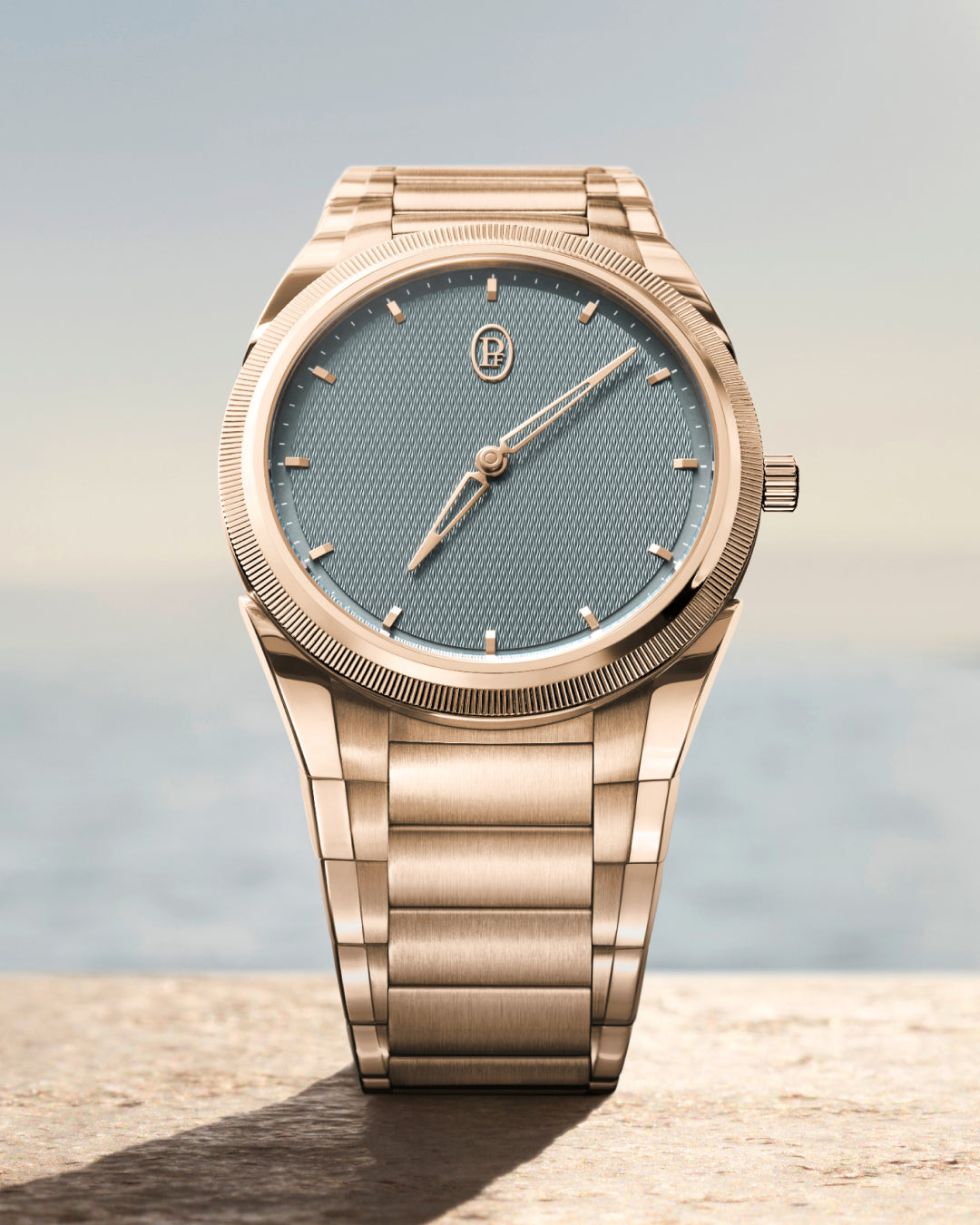 In rose gold, the Tonda PF Micro-Rotor gains tactility and depth while preserving the collection’s disciplined design language. The 40 mm case and integrated bracelet frame the Grain d’Orge guilloché dial, whose Agave Blue tone shifts subtly throughout the day.