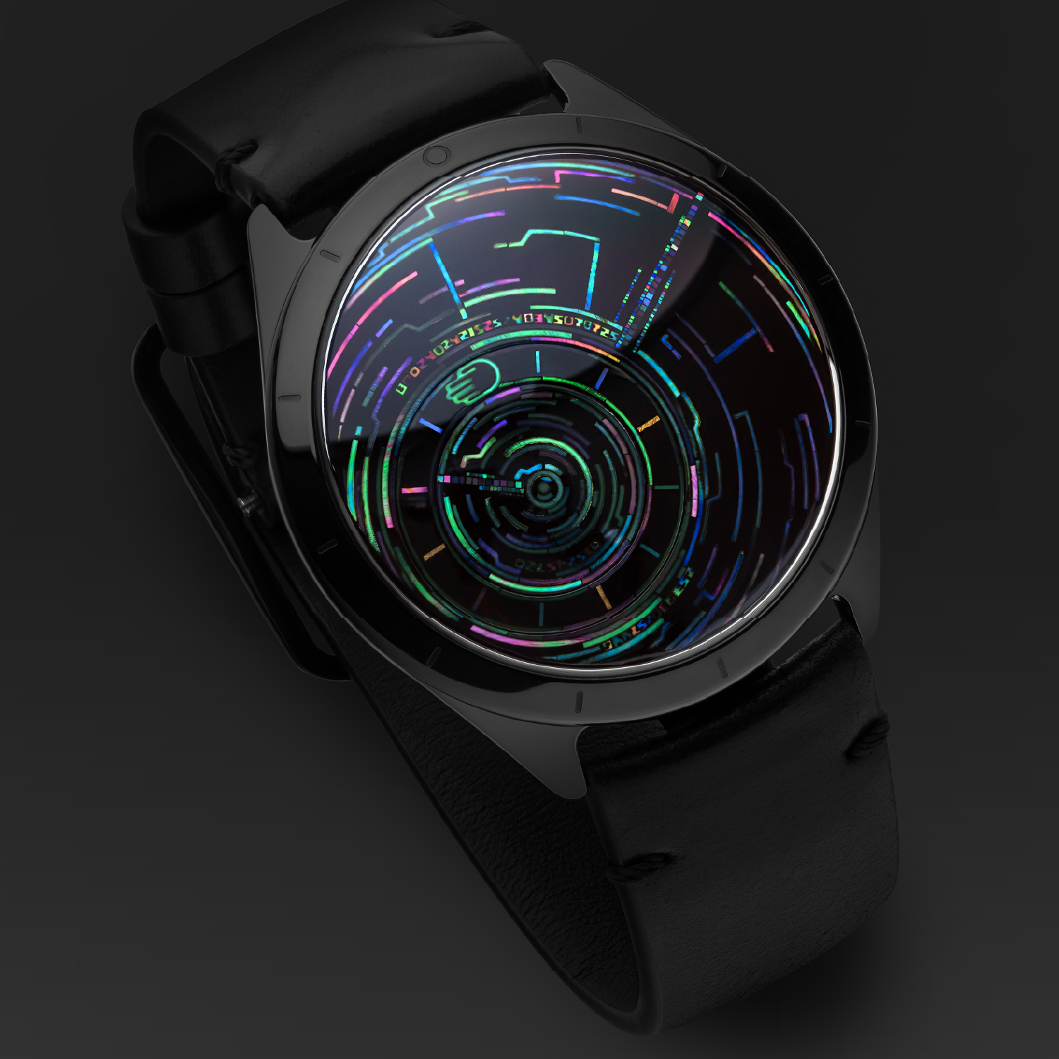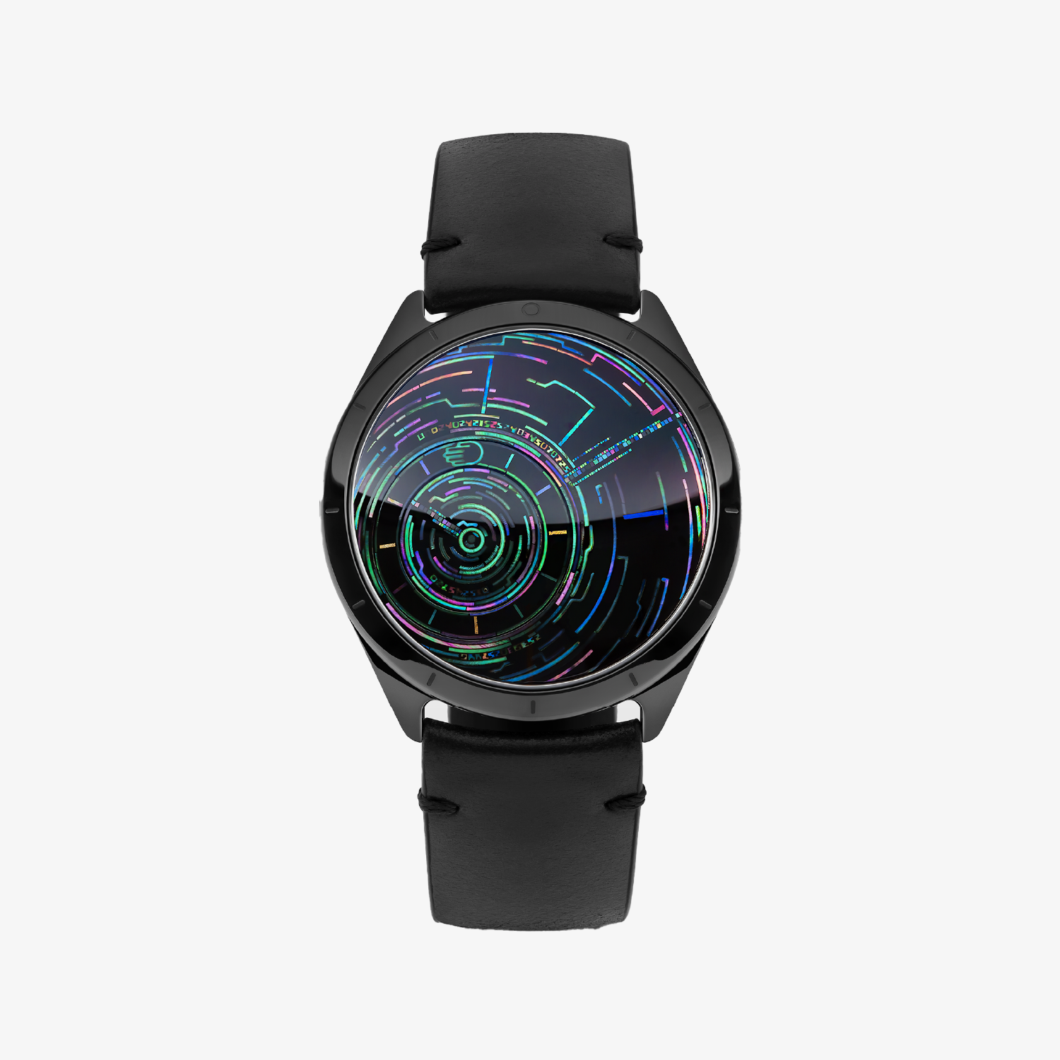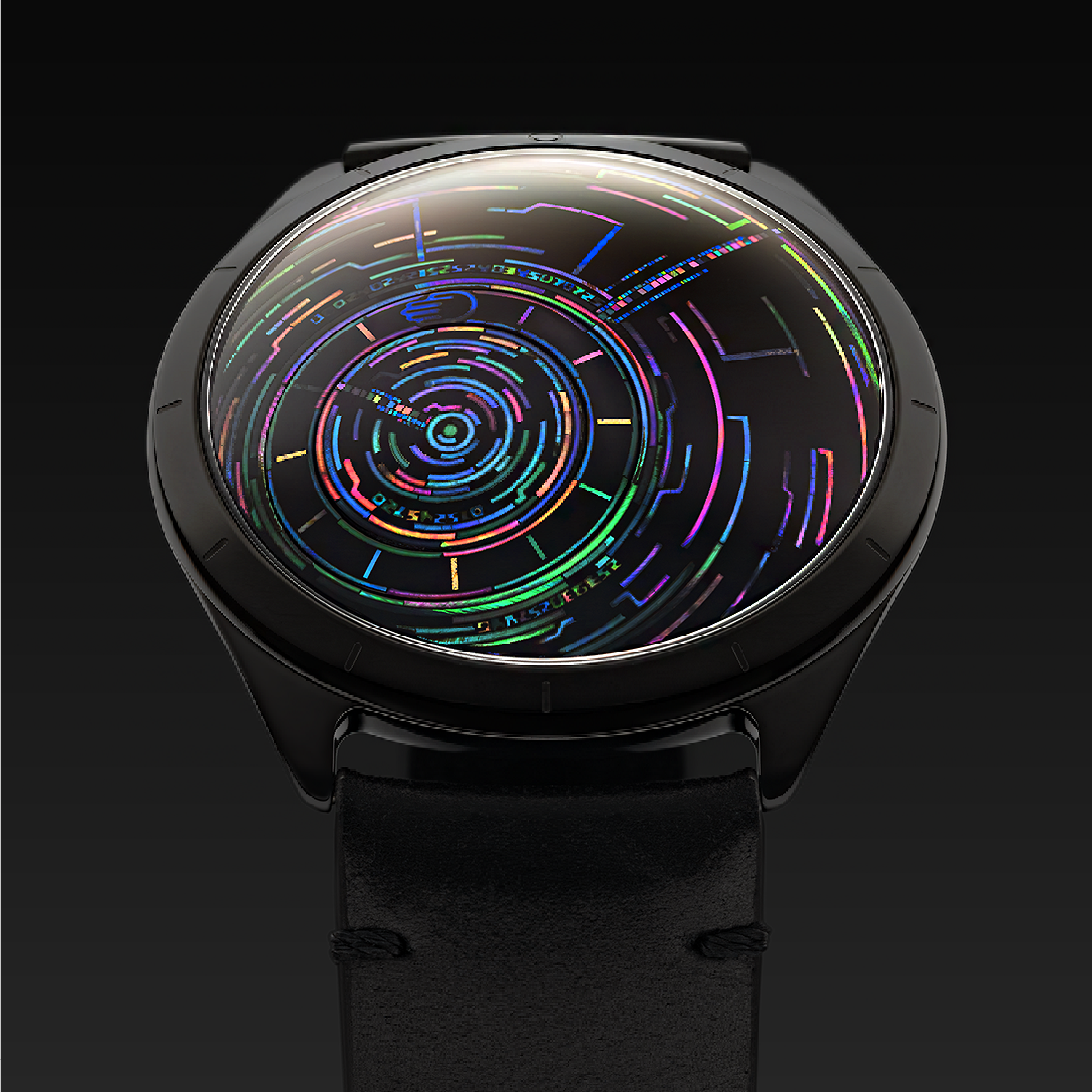 The DLC-coated titanium architecture frames a dial built using traditional Japanese urushi lacquer and raden mother-of-pearl inlay. Each element is meticulously shaped and layered by hand, following the curvature of the rotating convex display. Inspired by planetary motion and heliocentrism, the composition evolves continuously as the ROCS display rotates, creating the impression of a coded message drifting through space.