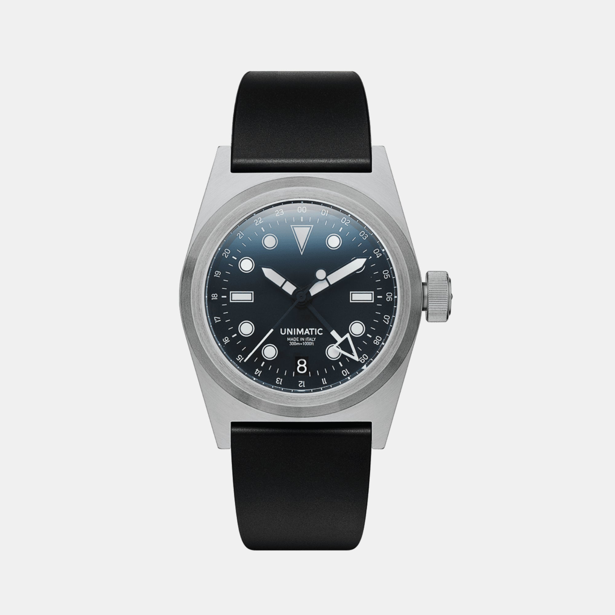 Inside, the NH34A automatic movement operates at 21,600 bph, with 41-hour power reserve and hacking second hand. The watch comes with a charcoal grey tapered 22-20mm TPU strap, stainless steel brushed hardware signed UNIMATIC, and quick-release system for easy strap changes.